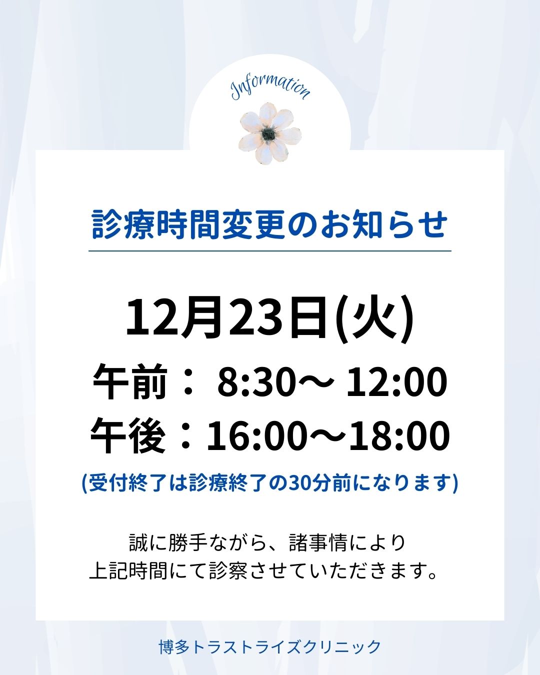 12/23(火)の診療時間変更に関するお知らせです。