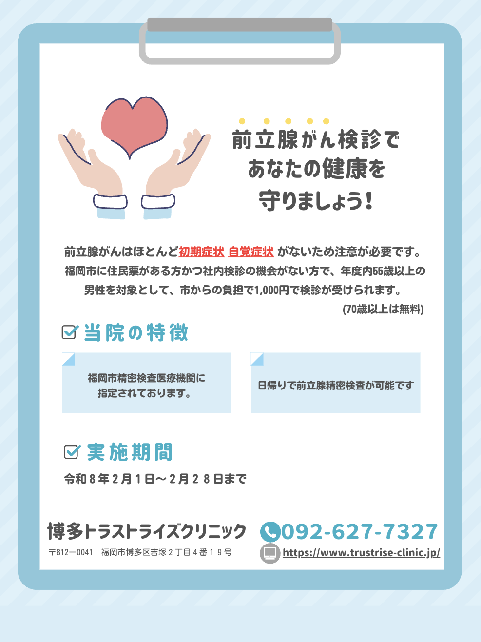 福岡市に住民票がある方かつ職場にて受診の機会がない方で、年度内55歳以上の男性を対象として、市からの負担で1,000円で検診が受けられます🏥✨